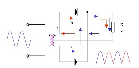全波整流電路:利用副邊有中心抽頭的變壓器和兩個(gè)二極管構成如下圖所示的全波整流電路,從圖中可見(jiàn),正負半周都有電流流過(guò)負載,提高了整流效率。