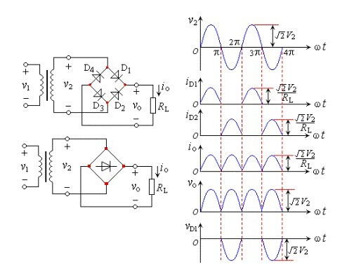 單相橋式整流電路是最基本的將交流轉換為直流的電路,在分析整流電路工作原理時(shí),整流電路中的二極管具有單向導電性。當正半周時(shí),二極管D1、D3導通,在負載電阻上得到正弦波的正半周。當負半周時(shí),二極管D2、D4導通,在負載電阻上得到正弦波的負半周。在負載電阻上正、負半周經(jīng)過(guò)合成,得到的是同一個(gè)方向的單向脈動(dòng)電壓。